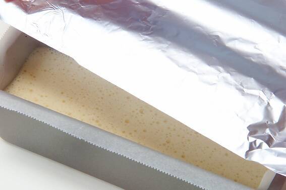 全体に混ぜ合わせて、型に流し入れ、アルミホイルをかぶせ、180℃に予熱したオーブンで3~4分焼く。いったん取り出し木べらで底からゆっくり優しく混ぜ、180℃のオーブンに入れて3分焼く。