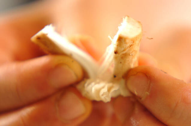 シイタケは石づきを切り落として軸と笠に切り分け、かたく絞ったぬれ布巾で汚れを拭き取る。軸は縦2~4つに裂き、笠は食べやすい大きさに切る。