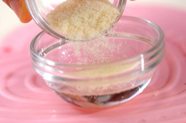 粉ゼラチンは水に振り入れて、ふやかす。 バニラアイスは室温でやわらかくしておく。