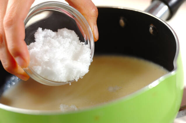 砂糖、塩を加えて中火で温め、砂糖が煮溶けたら火を止めて器によそい、きな粉を振る。