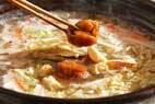 お米が柔らかくなれば、白菜、大根、ニンジンを加えて4~5分煮る。野菜がしんなりすれば油揚げ、つけダレから生麩だけを加え、ひと煮立ちさせる。