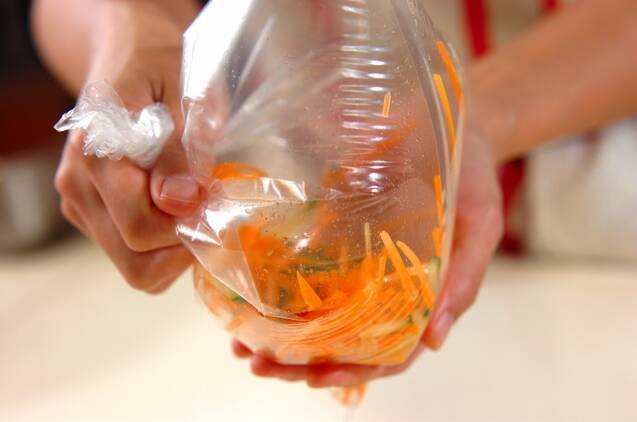 抗菌ビニール袋に、ニンジン、キュウリ、塩を入れる。袋に空気を入れて袋の口をしっかり持ち、全体に塩をからめるように袋を振る。