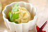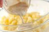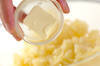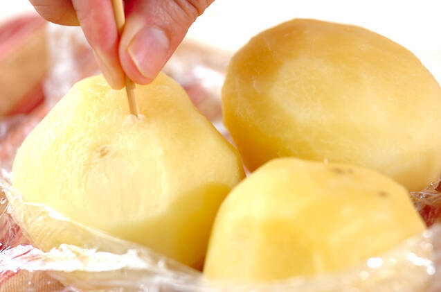 ジャガイモは皮をむいてサッと水に通し、ぬれたままラップで包んで、電子レンジで6~7分(途中で向きを変えて)竹串がスッと刺さるまで加熱する。電子レンジは600Wを使用しています。