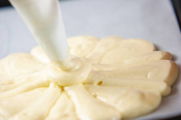 天板にクッキングシートを敷いて直径1~1.2cmの丸口金で6x57cm帯に絞り出す。また、直径16cmの底用、直径18cmの蓋用も絞り出す。