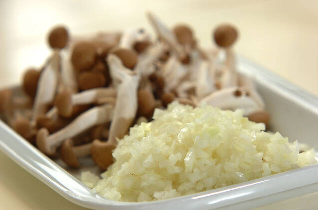 玉ネギはみじん切りにする。シメジは石づきを切り落とし、小房に分ける。