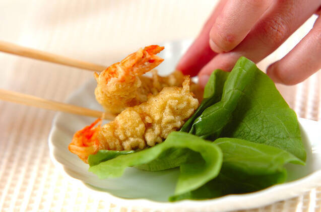 器にサラダ菜をしき、(1)のエビの天ぷらを盛る。お好みでミルびき岩塩をかけて下さい。