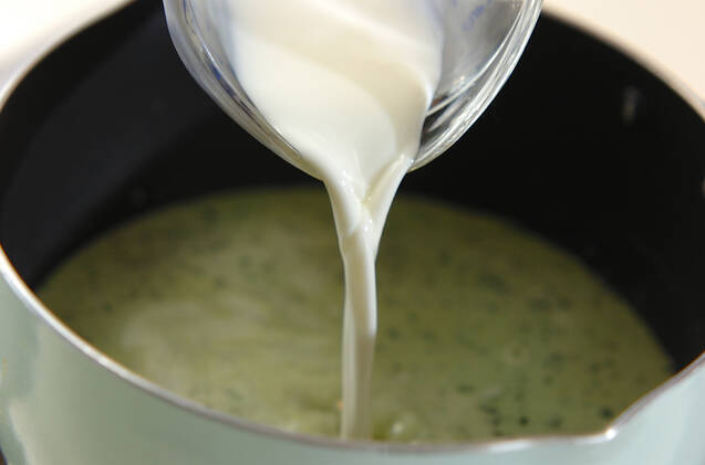 残りの牛乳を加えてひと混ぜし、鍋底を氷水にあて、トロミがつくまで木ベラ等で混ぜ合わせる。器に注ぎ、冷蔵庫で冷やしかためる。