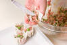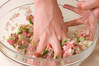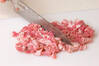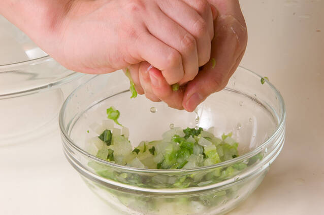 白菜は熱湯に入れゆで水に取り、粗熱が取れれば水気をきってみじん切りにし、しっかり水気を絞る。