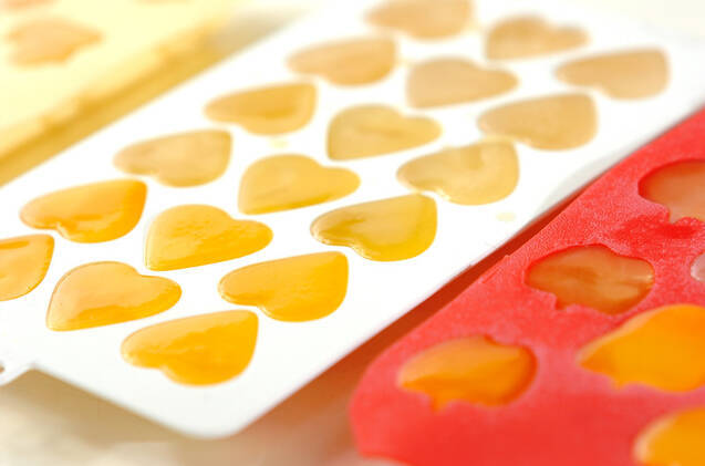 フルーツジュースは、それぞれ製氷皿に注ぎ入れて凍らす。微炭酸水はよく冷やす。
