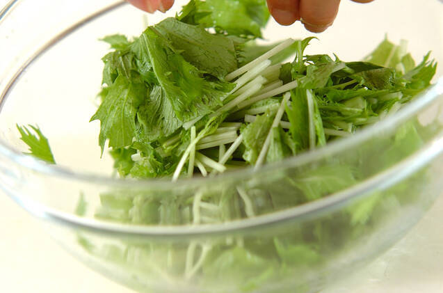水菜は根元を切り落とし、長さ4cmに切る。塩少々を振って全体に混ぜ合わせ、少ししんなりさせる。