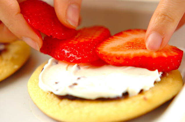 どら焼きをあけ、マスカルポーネチーズ、イチゴをのせ、もう一度サンドして器に盛る。