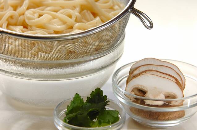 うどんはたっぷりの熱湯に入れ、ほぐれたらザルに上げてゆで汁をきり、冷水でしっかり締めて水気をきる。シイタケは軸を切り落とし、薄切りにする。ミツバは長さ4cmに切る。
