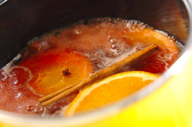 鍋に赤ワイン、オレンジ、シナモンステックを合わせ、弱火~中火で煮る。