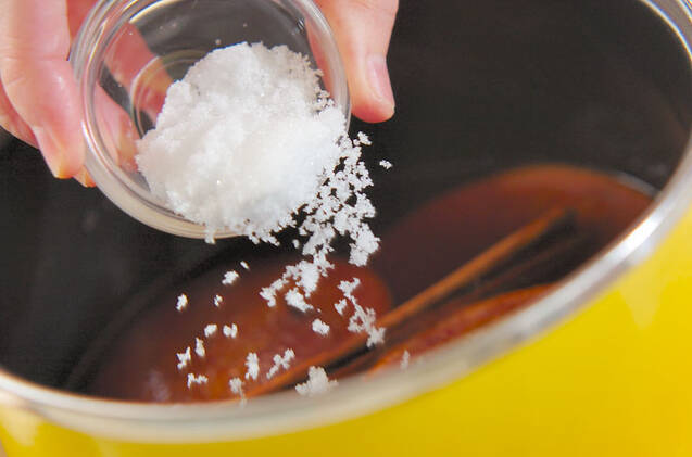 煮たってきたら沸騰しないように気をつけて5~6分煮る。砂糖を入れ、溶けたらグラスにオレンジごと注ぐ。