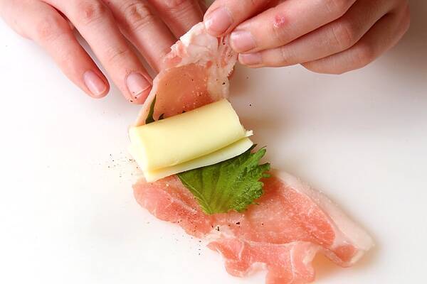 豚薄切り肉は塩コショウをふり、縦半分に切った大葉をのせる。半分に切り、2つ折りにしたスライスチーズをのせてロールに巻き、串を刺す。