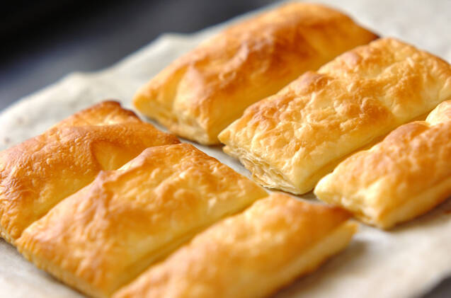 オーブンシートを敷いた天板に冷凍パイシートを並べ、250℃に予熱しておいたオーブンに入れ、表面に焼き色がつくまで8~10分焼く。