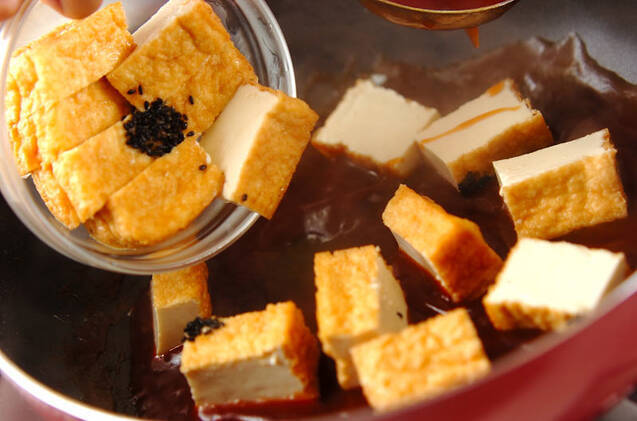 (2)に厚揚げと(1) の野菜を戻し、全体にタレがからまったら、ゴマ油を加えて香りをつけ、器に盛り分ける。