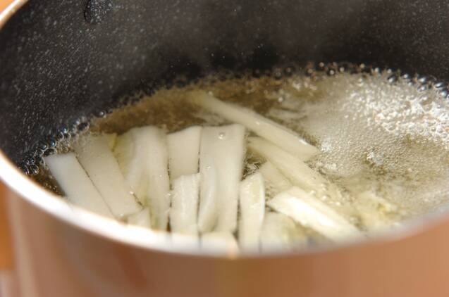 鍋にだし汁を入れて強火にかけ、白菜の芯を入れて煮る。