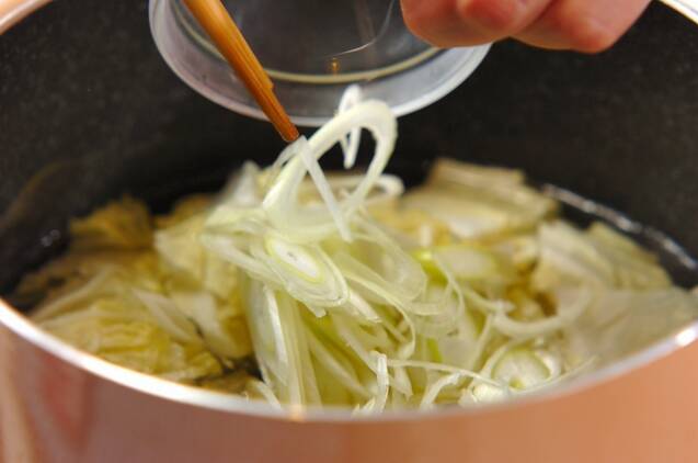 白菜の芯が柔らかくなったら葉と白ネギを加えてしんなりするまで煮る。