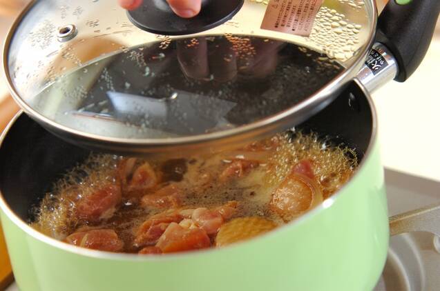 <調味料>につけた鶏もも肉を汁ごと加えて火を強め、煮たったら再び鍋に蓋をして弱火で3分蒸し煮にする。