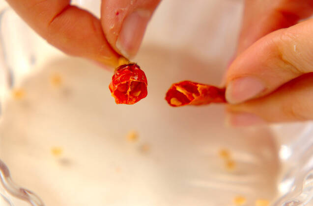 赤唐辛子は軸と種を取り、2~3つに割る。