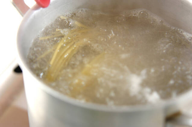 たっぷりの熱湯に塩16gを入れ、スパゲティーを袋の指定時間より1分短くゆでて水気をきる。