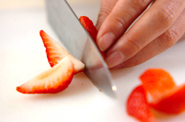 イチゴは水洗いしてヘタを切り落とし、縦に4等分する。