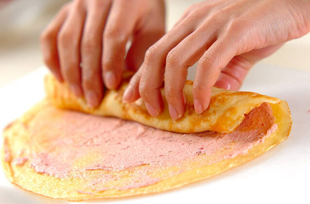 <クレープ>に<ピンククリーム>をぬり、イチゴを横に並べる。イチゴを芯にしてくるくる巻き、ラップに包んで冷蔵庫で冷やしておく。食べる直前に食べやすい大きさに切り、器に盛る。お好みで粉糖を振る。(ヒント)調理時間に冷やす時間は含んでいません。