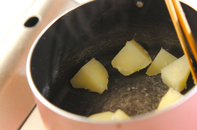 鍋に皮をむき、ひとくち大に切ったジャガイモとひたひたの水を入れ、中火にかける。柔らかくなったらお湯を捨て、ジャガイモの水分をとばす。