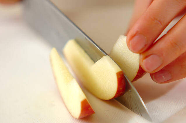 リンゴは皮ごときれいに水洗いし、縦4等分に切って芯を取り、さらに縦3~4等分の薄切りにし、分量外の塩水に放つ。