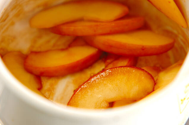 <リンゴ煮>を作る。鍋、または小さいフライパンに、水きりしたリンゴ、砂糖、レモン汁を入れて強火にかける。煮たったら火を弱め、蓋をして時々ゆすりながら4~5分蒸し焼きにし、最後に蓋を外して強火にし、水分を飛ばして冷ましておく。
