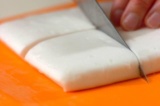 ハンペンは4等分に切る。<合わせ調味料>の材料をよく混ぜ合わせておく。