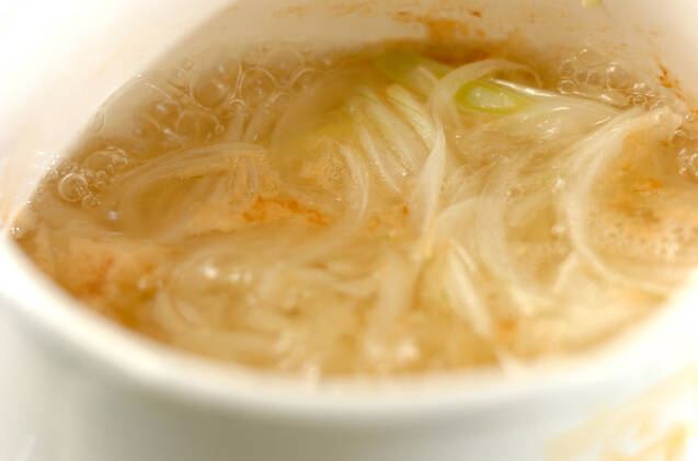 鍋に新玉ネギ、ジャガイモ、水、顆粒スープの素を入れて強火にかける。煮たったら火を弱め、10分煮る。