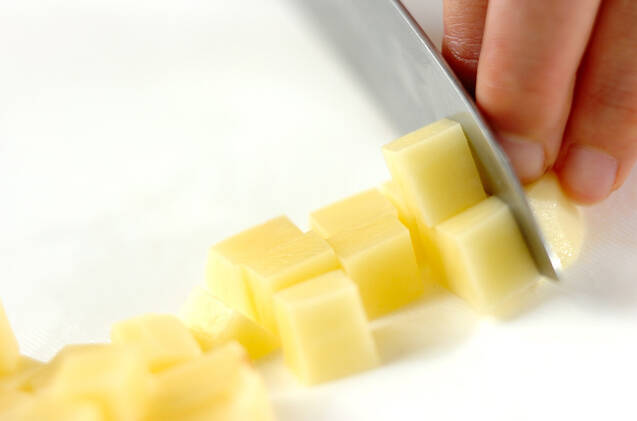ジャガイモは皮をむき、1cm角に切って水に放ち、水気をきる。