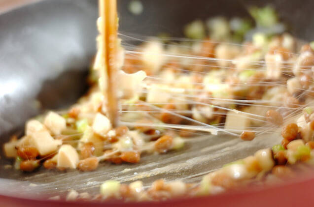 パスタをゆでている間に、フライパンにサラダ油大さじ1を熱してショウガ、白ネギの芯の部分を炒め、香りがたったら、納豆、シイタケ、水煮タケノコを炒め、いったん取り出す。