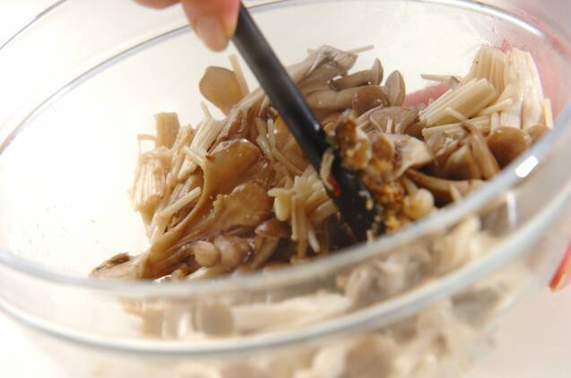 ボウルに<調味料>の材料を混ぜ合わせ、汁気をきった(1)を加えて和える。器に盛り、白ゴマを散らす。