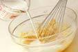 コーンスターチ、薄力粉、きな粉を加え、粉っぽさがなくなるまで混ぜ合わせ、牛乳を加えて更に混ぜ合わせる。