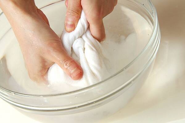 おからは目の細かい布巾に包んで水で軽く洗い、固く絞って水切りをする。