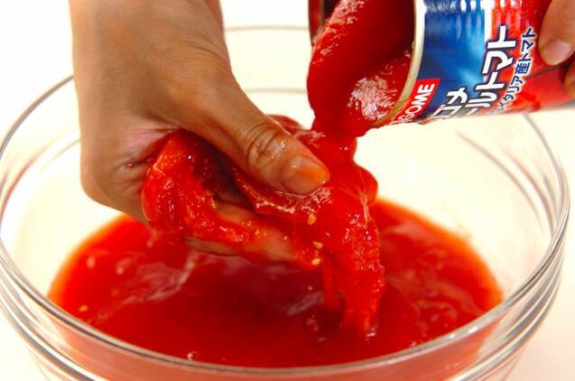 水煮トマト缶がホールの場合は、手でつぶしておく。種や皮が気になる場合は、網を通して取り除く。