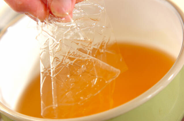 鍋に<コンソメゼリー>の水を入れて火にかけ、沸騰したら固形スープの素を加えて溶かし、火から下ろして準備しておいた板ゼラチンの水気を絞って加え、溶かす。