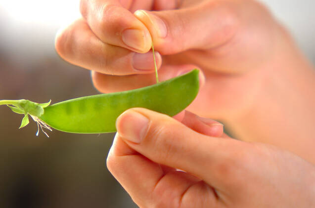 キヌサヤは筋を引き、分量外の塩を入れた熱湯でゆでて水に取る。粗熱が取れたら水気をきり、斜め切りにする。