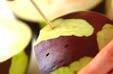 加茂ナスは上下を切り落として、縦縞に皮をむき、横半分に切り、竹串で全体に刺しておく。半分に切った面は皮から内側に一周切り込みを入れ、更に格子に切り込みを入れる。(米ナスの場合は縦半分に切って下さい)
