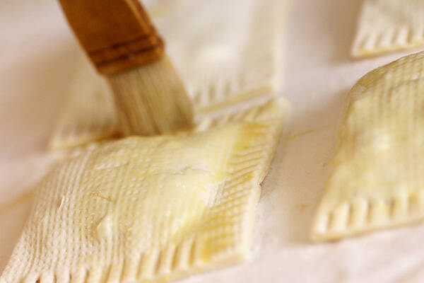 オーブンの天板に並べ、表面に卵黄液をぬり、200℃に予熱をしたオーブンで200℃で10~12分、表面に焼き色が付く位まで焼く。