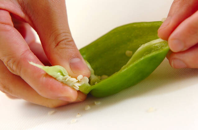 ピーマンは縦半分に切り、ヘタと種をきれいに取り除く。