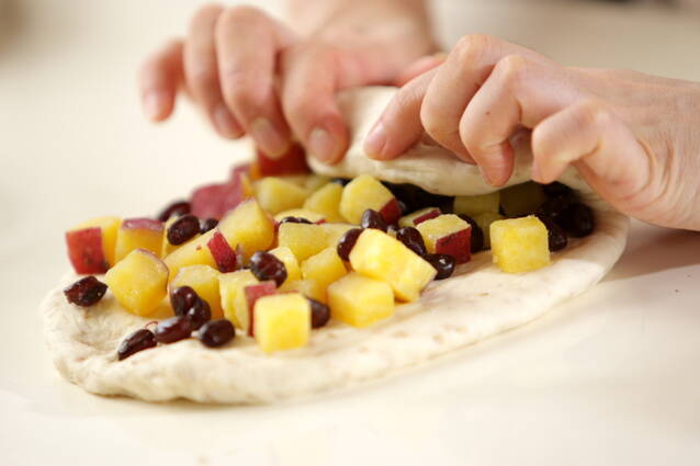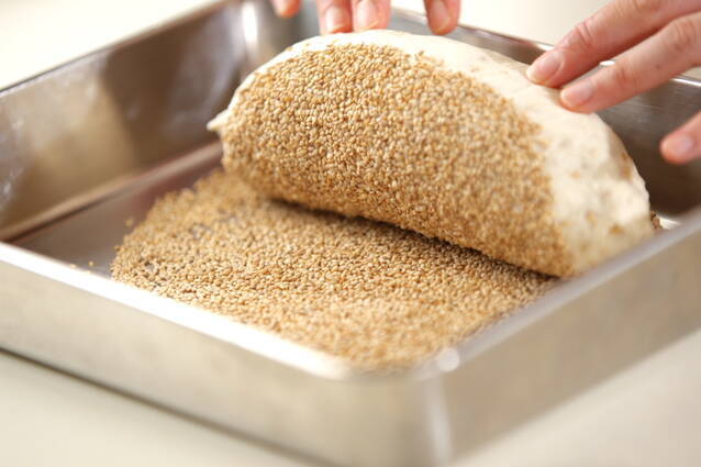 休ませた生地をめん棒で厚さ1cmの楕円形にのばす。<サツマイモの甘煮>と甘納豆をおいて手前から巻き、巻き終わりをしっかりと閉じる。固く絞った布巾の上で生地を転がしてから表面に白ゴマをまぶす。