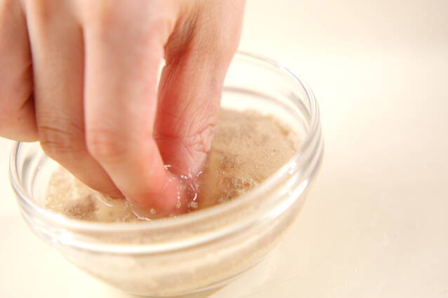 ぬるま湯を材料分から少量取り分け、その中にイーストを入れて指ですり合わせるようにして溶かす。