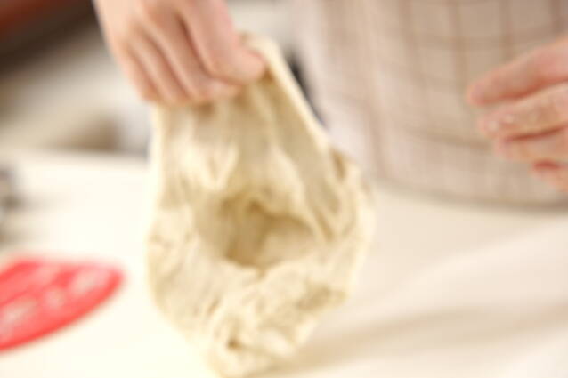 ボウルの中で生地がまとまったら台に移し、手のひらで生地を台にこすりつけながら、台や手に付かなくなるまでこねる。弾力が出てきたら、時々台に生地をたたきつけ、さらにこねる。