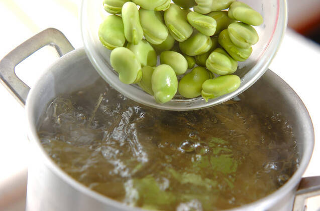スパゲティをゆでる。塩を入れたたっぷりの熱湯にスパゲティを入れ、常にクツクツ煮たった状態を保ちながら、時々菜ばしで混ぜ、指定の時間より1分短めにゆで、スパゲティがゆで上がる1分前に春キャベツ、ソラ豆を加えて一緒にゆでる。