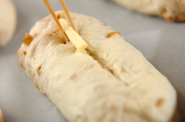 キャンバス布からオーブンシートに移し、包丁で切り込みを入れ、切り口に<仕上げ用>の無塩バターをのせ、霧吹きで水をかける。220℃に予熱しておいたオーブンで20分焼く。