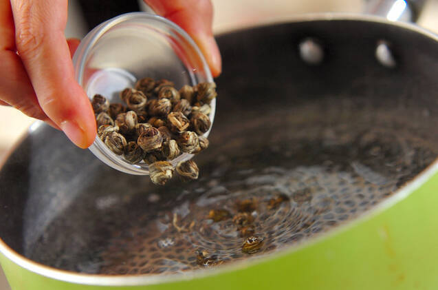 鍋に水を入れて強火にかけ、煮たったらジャスミンティーを入れて弱火で5分煮出す。
